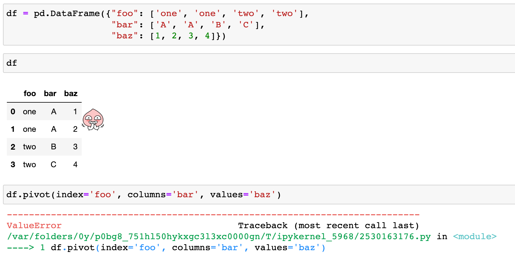 인덱스/column에 대해 동일한 row가 생기면 발생되는 에러입니다. (Notice that the first two rows are the same for our index and columns arguments.)