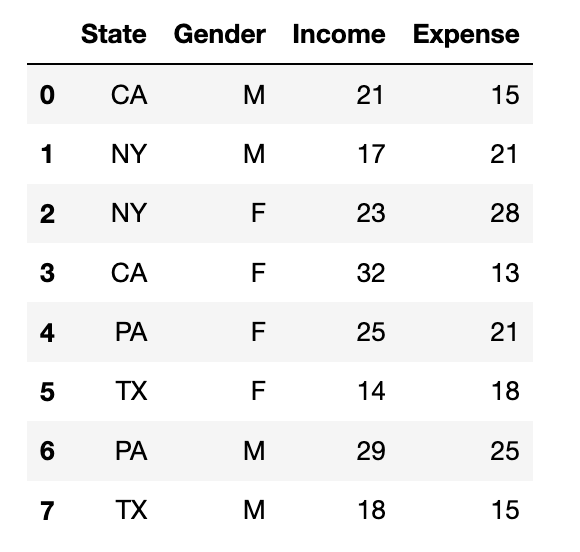 {'State':['CA', 'NY', 'NY', 'CA', 'PA', 'TX', 'PA', 'TX'],