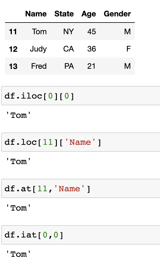 iloc, iat은 index를 사용해서 값을 가져오며 loc, at은 key, column명으로 값을 가져오는 것을 알 수 있습니다.