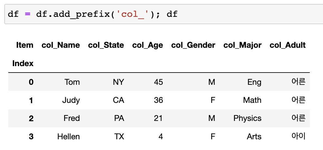 >> df.index.name='Index'; df.columns.name='Item'; df